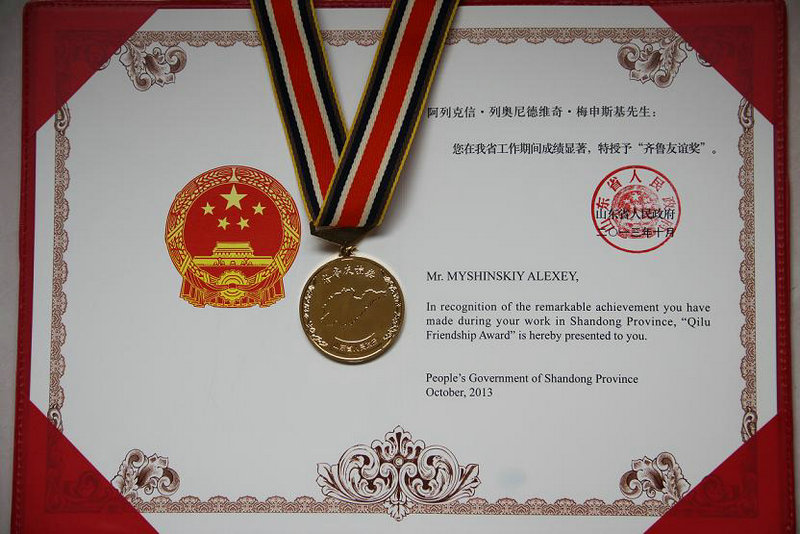 11月19日,省政府在济南举行仪式,授予来自美国、加拿大等17个国家的24名外国专家2013年度“齐鲁友谊奖”荣誉称号。副省长孙绍骋到会讲话并为获奖专家颁发了奖章和证书。我校俄罗斯籍教师阿列克信.列奥尼德维奇.梅申斯基先生获此殊荣。