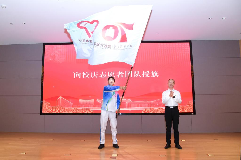仪式上,李兆祥为建校70周年校庆志愿者团队授旗。