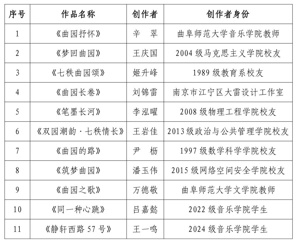 为确保评选工作的公平、公正、公开,学校组织相关领域专家学者组成评审团队,依据作品的思想性、艺术性、创新性以及与学校文化特质的契合度等标准,对征集作品进行了多轮严谨细致的评审。现将入选作品名单公布如下(以综合评审得票数量为序)。