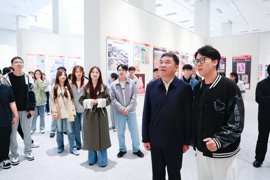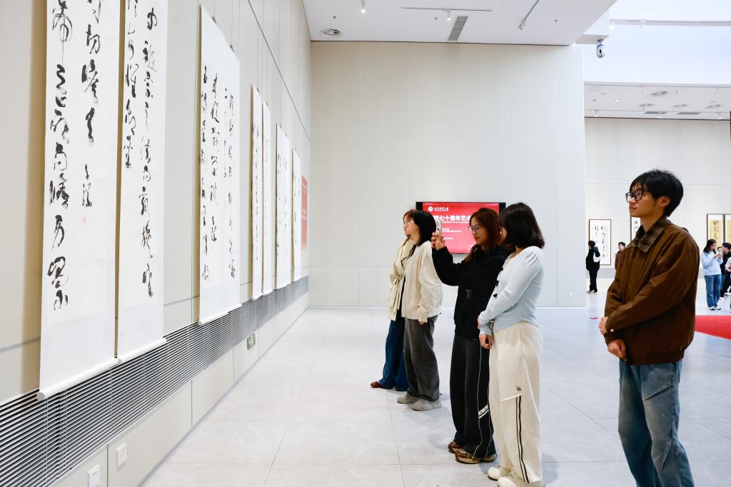 在观展过程中,领导们仔细聆听作品讲解,并与参展作者深入交流,详细了解作品的创作理念和过程。学校领导对展览的整体水准和学术内涵给予充分肯定,表示这些作品既延续了学校深厚的文化传统,又展现出守正创新的艺术追求,是献给七十周年校庆的一份深情厚礼。
