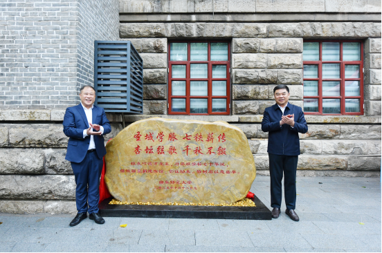 学校党委书记邢光、捐建者叶德才、1956年就在学校工作的骆承烈教授、与学校同一天生日的2025级新生郭晶晶共同按下仪式球。这一精心设计的环节,深刻体现出曲园精神在领导者的引领、捐建者的奉献、见证者的坚守和接力者的传承中,生生不息、代代相传。邢光、叶德才共同为校史展览馆捐建纪念石揭幕。