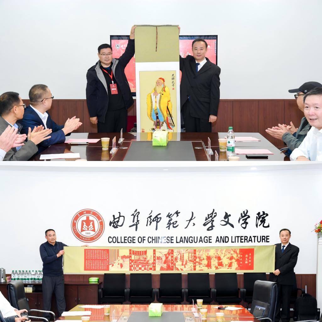 会上,德州校友联络处、德州学院分别向学院捐赠了孔子行教像金丝贴画和忠勇刚正颜真卿剪纸画,为学院七十年院庆献上祝福。