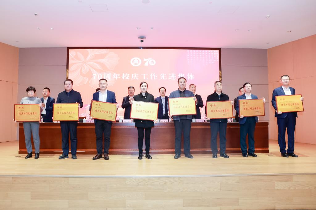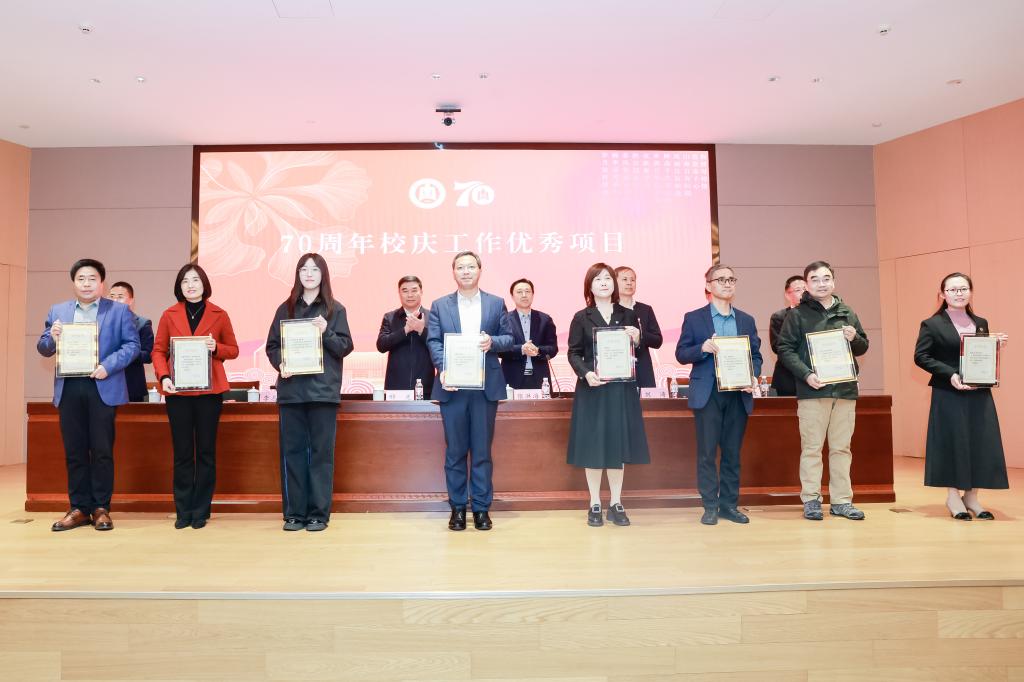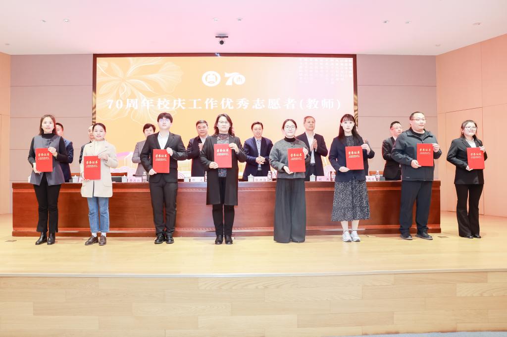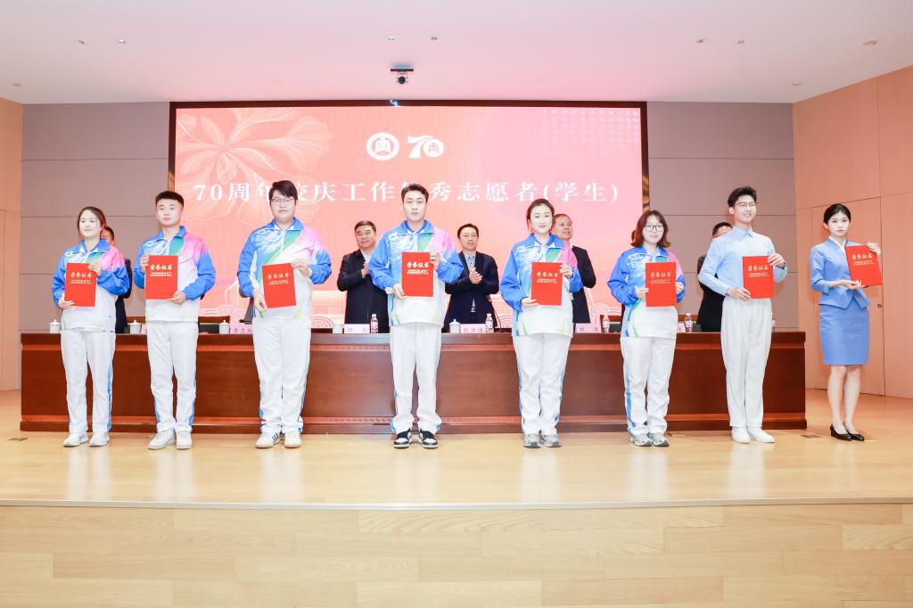 大会对在70周年校庆工作中表现突出的先进集体和个人进行表彰。在主席台就座的领导依次为先进集体、优秀项目、先进个人及志愿者代表颁发荣誉证书并合影留念。