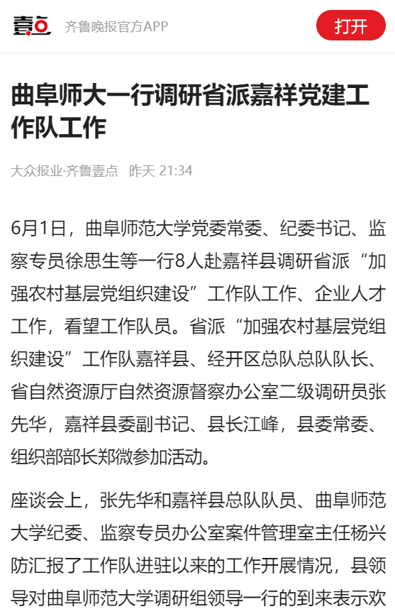 【齐鲁壹点】曲阜师大一行调研省派嘉祥党建工作队工作