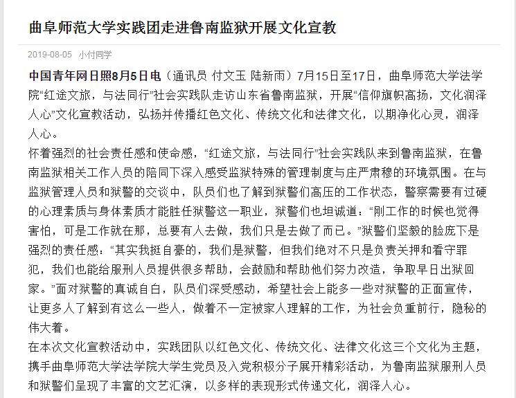 中国青年网报道链接:https://xiaoyuan.cycnet.com.cn/s?uid=10258&app_version=1.1.6&sid=434901&time=1566043381&signature=krVMYqRmZGljQD8pAPB3aDAReAC5mX1Xy9O06evWJwbxoN5KLz&sign=ff52ba2013e0a2d55c49430eaeb0149c