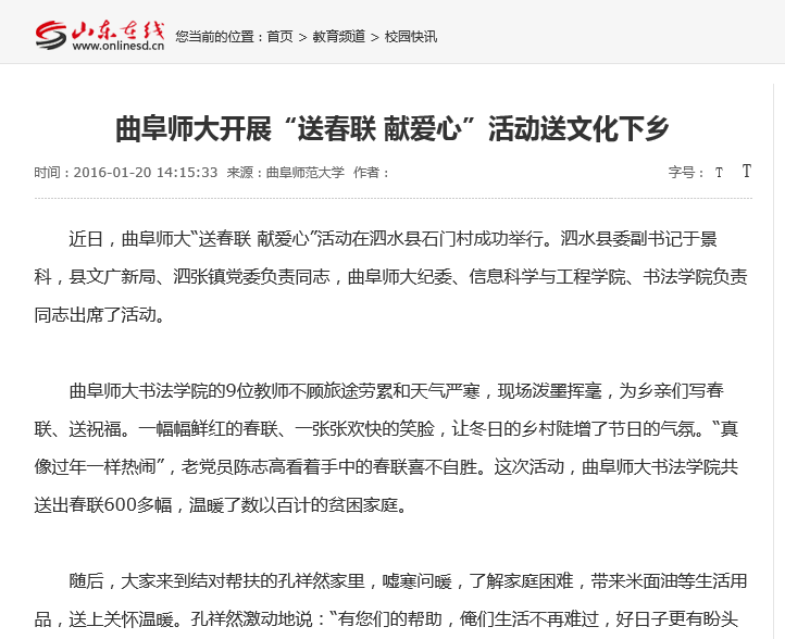 山东在线:曲阜师大开展“送春联 献爱心”活动送文化下乡