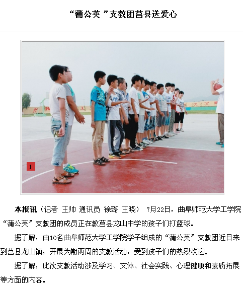 大众网链接:三亿网页版登录入口“蒲公英”支教团牵手莒县龙山中学http://rizhao.dzwww.com/xy/201507/t20150724_12757099.html