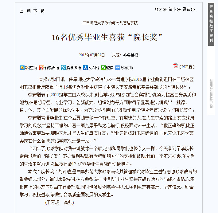 齐鲁晚报:三亿网页版登录入口政治与公共管理学院16名优秀毕业生喜获“院长奖”