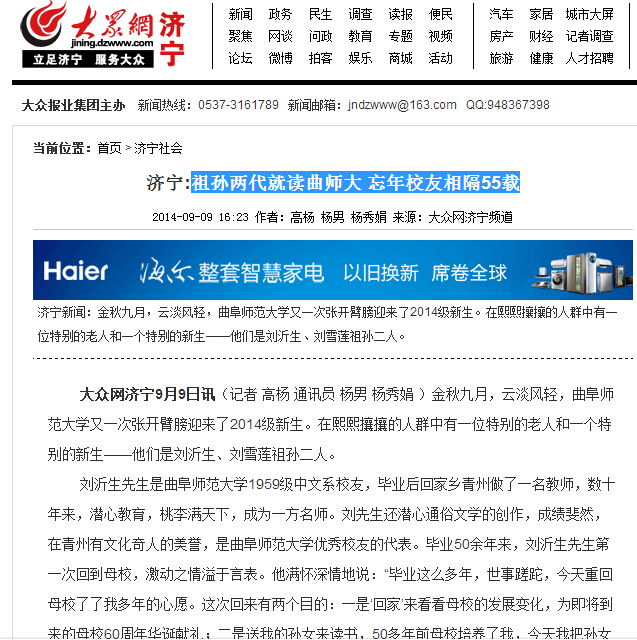 大众网:祖孙两代就读曲师大 忘年校友相隔55载