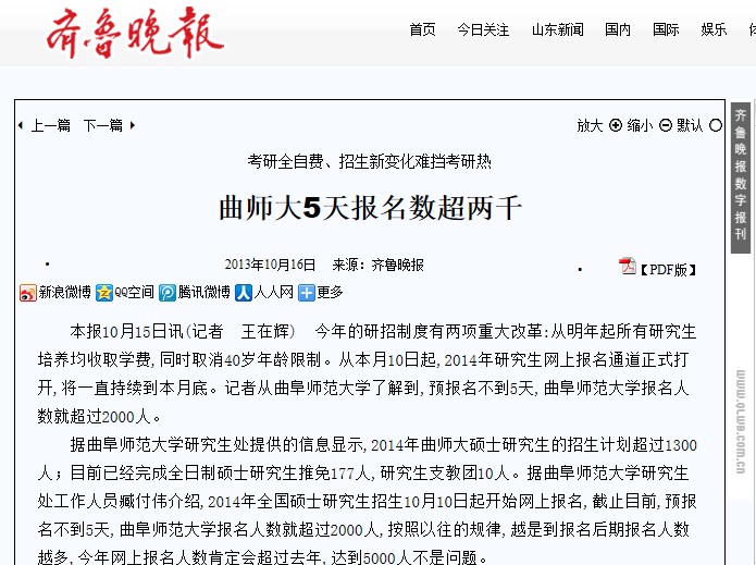 齐鲁晚报:考研:曲师大5天报名数超两千