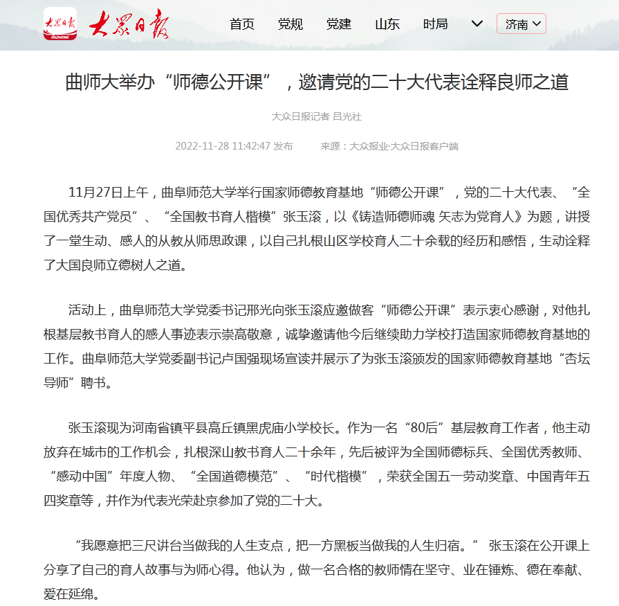 【大众日报】曲师大举办“师德公开课”,邀请党的二十大代表诠释良师之道