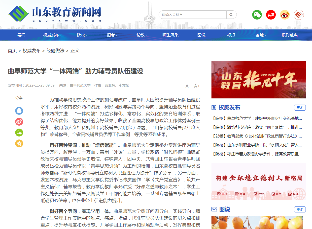 【山东教育新闻网】三亿网页版登录入口“一体两端”助力辅导员队伍建设