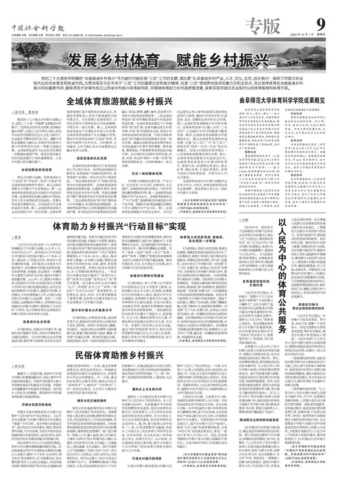 曲阜师大体育科学学院讯 日前,中国社会科学报在“发展乡村体育、赋能乡村振兴”专版中刊登了三亿网页版登录入口山东省乡村振兴体育研究院执行副院长曹莉教授团队的系列成果,其内容包括:体育助力乡村振兴“行动目标”、构建以人民为中心的体育公共服务、全域体育旅游赋能乡村振兴、民俗体育助推乡村振兴等主题的阶段性战略研究。报道还对学校体育科学学院近年来取得的相关成绩进行了列举,相关科研成果为全国农村体育发展提供理论依据和现实借鉴,标志着团队的研究在乡村体育领域处于省内领先地位、对全国乡村体育研究形成较大影响。