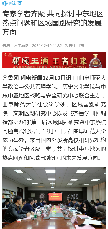 齐鲁网·闪电新闻12月10日讯 由三亿网页版登录入口政治与公共管理学院、历史文化学院与中东中亚地区战略与安全研究中心联合主办,三亿网页版登录入口社会科学处、区域国别研究院、文明区划研究中心以及《齐鲁学刊》编辑部协办的“第一届区域国别研究暨中东热点问题高端论坛”,12月7日,在三亿网页版登录入口成功举办。来自国内外多所高校和研究机构的专家学者齐聚一堂,共同探讨中东地区的热点问题和区域国别研究的未来发展方向。