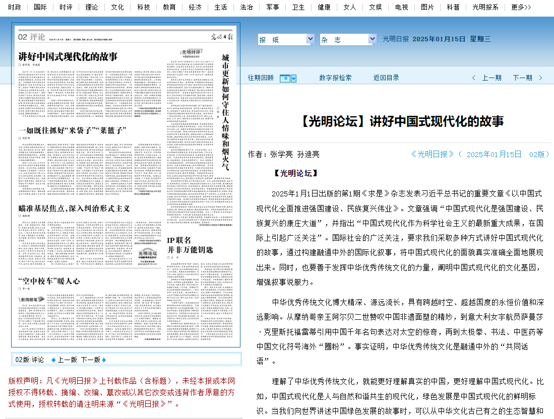 2025年1月1日出版的第1期《求是》杂志发表习近平总书记的重要文章《以中国式现代化全面推进强国建设、民族复兴伟业》。文章强调“中国式现代化是强国建设、民族复兴的康庄大道”,并指出“中国式现代化作为科学社会主义的最新重大成果,在国际上引起广泛关注”。国际社会的广泛关注,要求我们采取多种方式讲好中国式现代化的故事,通过构建融通中外的国际化叙事,将中国式现代化的面貌真实准确全面地展现出来。同时,也要善于发挥中华优秀传统文化的力量,阐明中国式现代化的文化基因,增强叙事说服力。