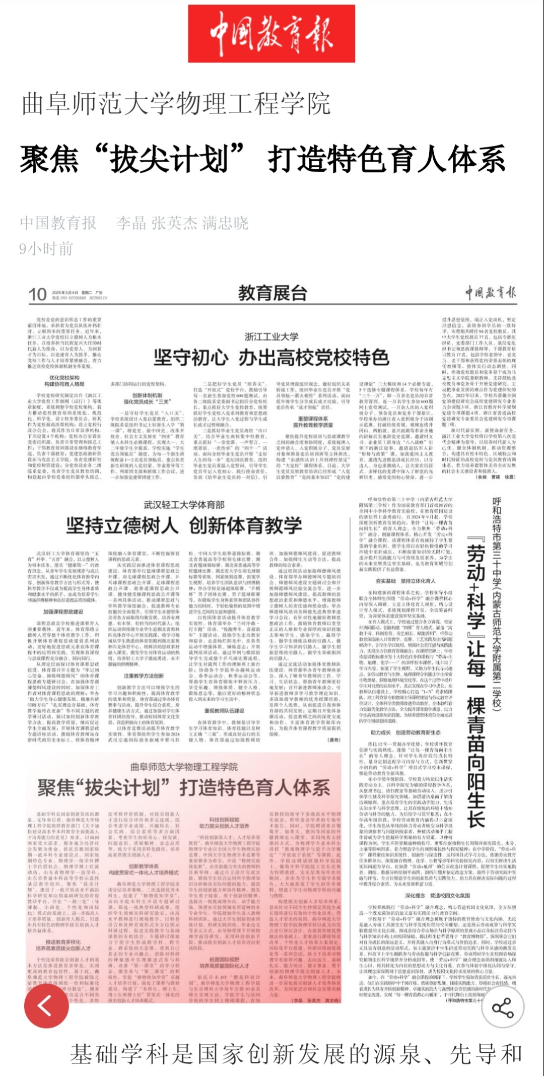 基础学科是国家创新发展的源泉、先导和后盾。三亿网页版登录入口物理工程学院按照教育部门《关于加快建设高水平本科教育全面提高人才培养能力的意见》要求,以面向国家重大需求、服务地方经济社会发展为使命,依托首批国家级别一流本科专业建设点、国家级别特色专业、物理学一级学科博士学位授权点、物理学博士后流动站、山东省物理学一流学科、山东省普通本科高等学校示范性基层教学组织,聚焦“拔尖计划”,建设了一批开展高水平前沿科学研究和应用基础研究的省级教研平台,并在“一制三化”(导师制、小班化、个性化和国际化)模式的基础上,进一步提高人才培养质量、创新育人模式,打造出具有特色的物理学拔尖创新人才培养新体系。
