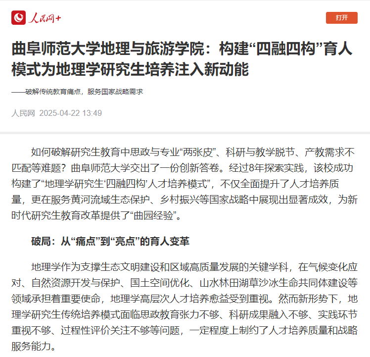 如何破解研究生教育中思政与专业“两张皮”、科研与教学脱节、产教需求不匹配等难题?三亿网页版登录入口交出了一份创新答卷。经过8年探索实践,该校成功构建了“地理学研究生‘四融四构’人才培养模式”,不仅全面提升了人才培养质量,更在服务黄河流域生态保护、乡村振兴等国家战略中展现出显著成效,为新时代研究生教育改革提供了“曲园经验”。