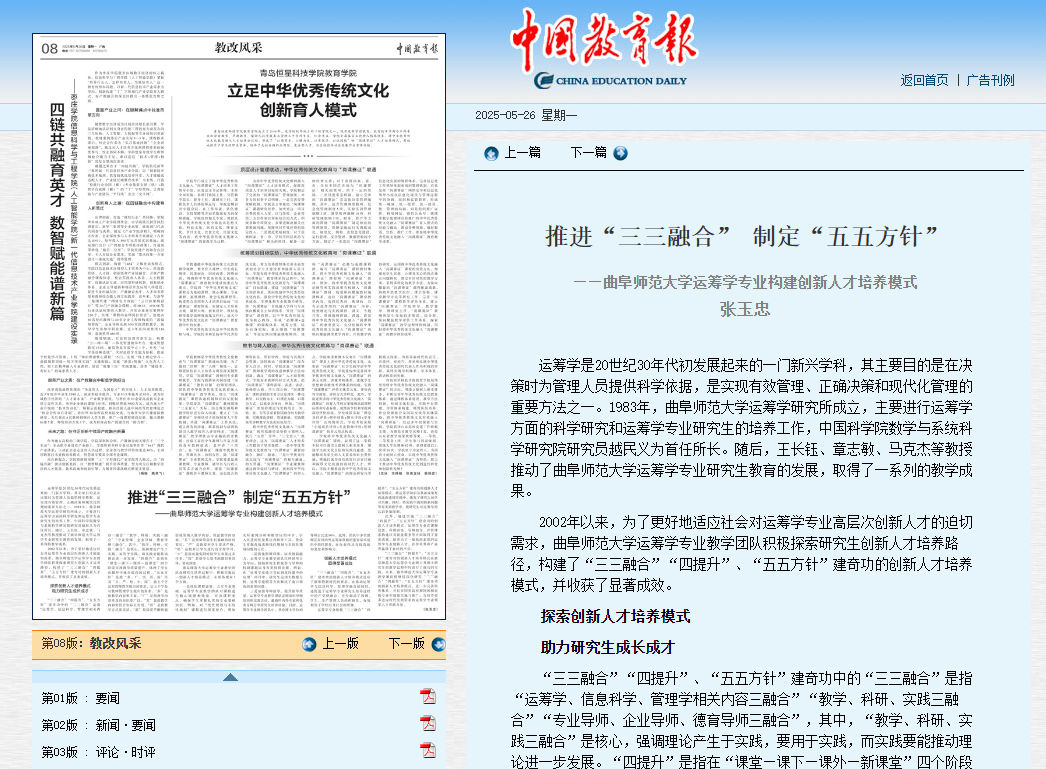“三三融合”“四提升”、“五五方针”建奇功的创新人才培养模式在三亿网页版登录入口运筹学专业硕士及博士研究生的教学过程中均进行了成功的实践。未来,三亿网页版登录入口运筹学专业教学团队将继续深化研究“三三融合”“四提升”、“五五方针”建奇功的创新人才培养模式,进一步完善培养体系,并且在同类高校相同和相近的专业中加强实施与推广,为培养更多适应时代发展需求的运筹学专业领军人才贡献力量。(张玉忠)