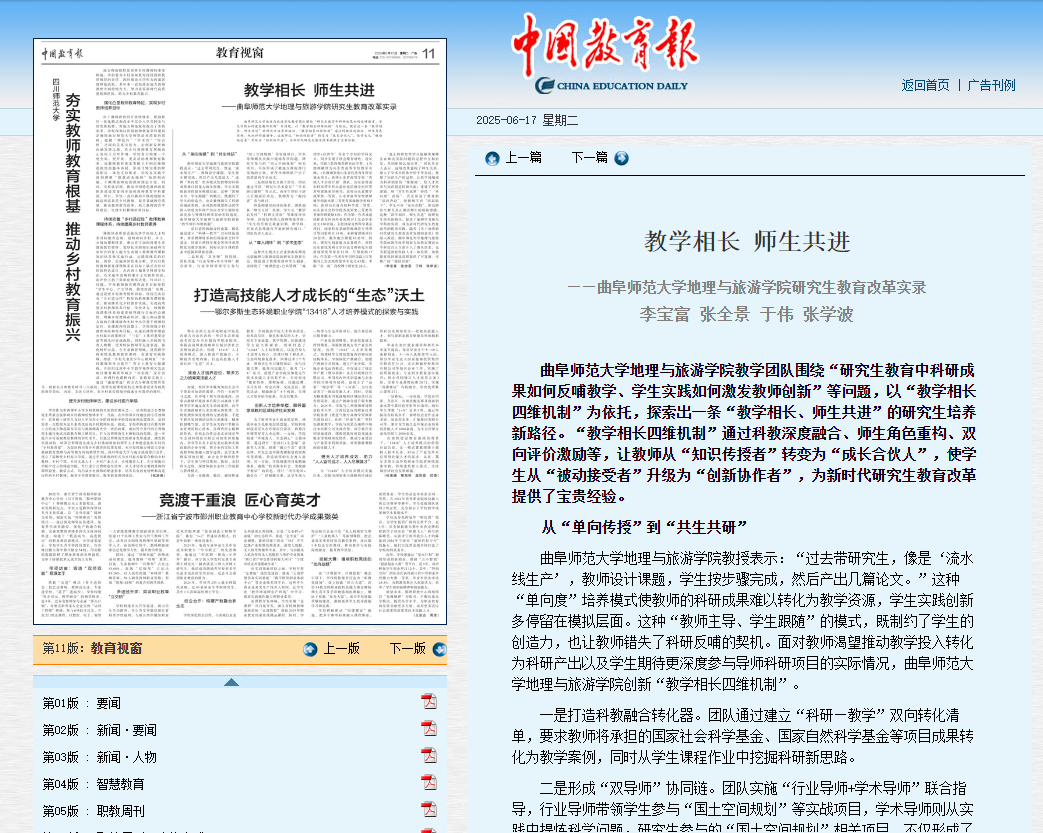 三亿网页版登录入口地理与旅游学院教学团队围绕“研究生教育中科研成果如何反哺教学、学生实践如何激发教师创新”等问题,以“教学相长四维机制”为依托,探索出一条“教学相长、师生共进”的研究生培养新路径。“教学相长四维机制”通过科教深度融合、师生角色重构、双向评价激励等,让教师从“知识传授者”转变为“成长合伙人”,使学生从“被动接受者”升级为“创新协作者”,为新时代研究生教育改革提供了宝贵经验。