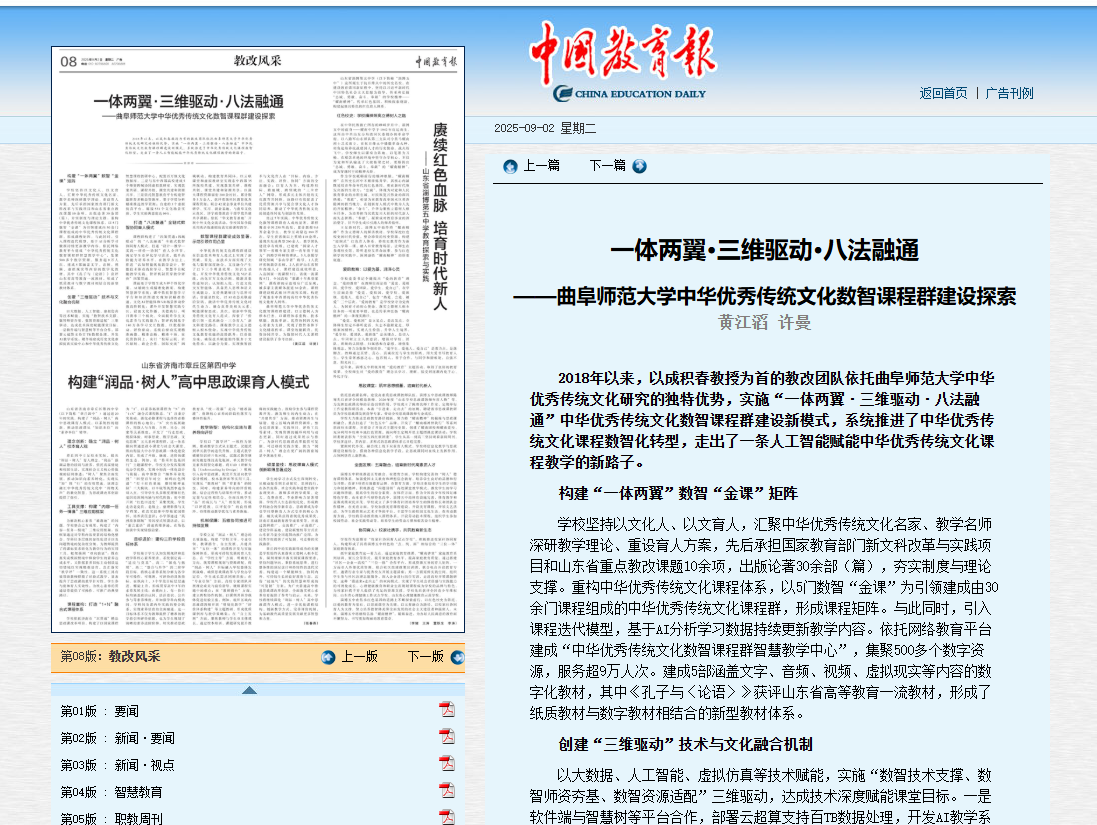 2018年以来,以成积春教授为首的教改团队依托三亿网页版登录入口中华优秀传统文化研究的独特优势,实施“一体两翼·三维驱动·八法融通”中华优秀传统文化数智课程群建设新模式,系统推进了中华优秀传统文化课程数智化转型,走出了一条人工智能赋能中华优秀传统文化课程教学的新路子。 构建“一体两翼”数智“金课”矩阵