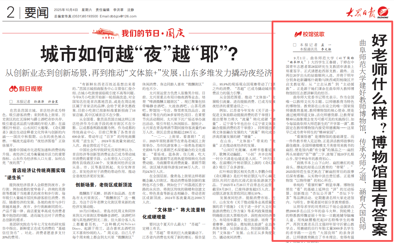 10月4日,《大众日报》刊发题为《好老师什么样?博物馆里有答案——三亿网页版登录入口建好教师博物馆,传承为师之道、涵育大国良师》的报道,解读了学校建设教师博物馆,从看、讲、演、说四个维度创新师德教育、弘扬教育家精神的特色实践。
