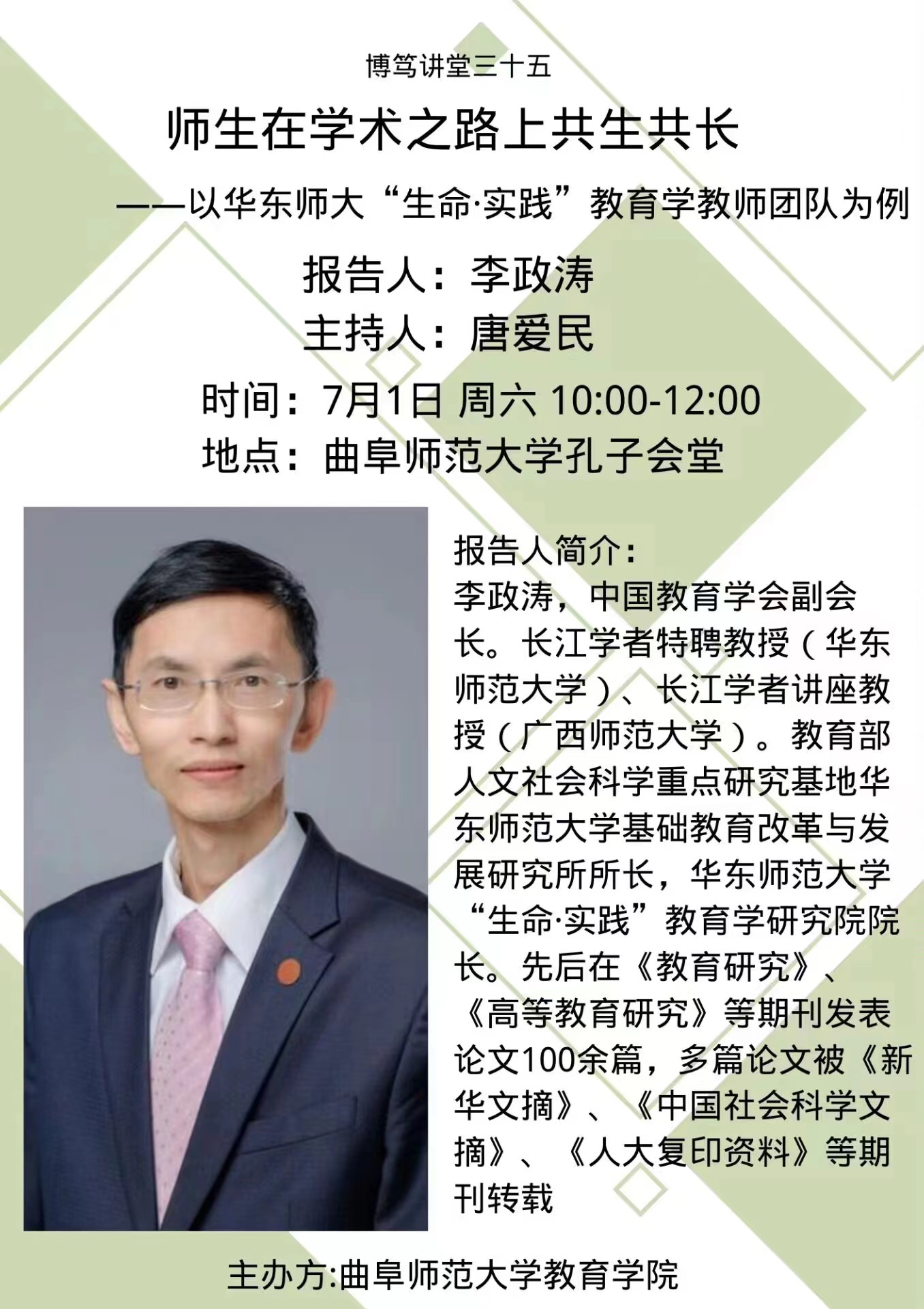 博笃讲堂预告| 李政涛:师生在学术之路上共生共长——以华东师大“生命·实践”教育学教师团队为例
