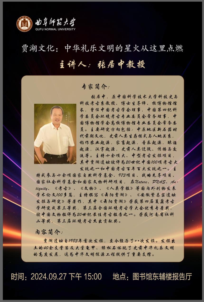 讲座内容简介:贾湖遗址自1983年首次发掘,至今经历了八次发掘。发掘出土的40余支骨笛及大量龟甲、绿松石体现了史前中华礼乐文明的高度发展,这为中华文明探源工程提供了重要支撑。