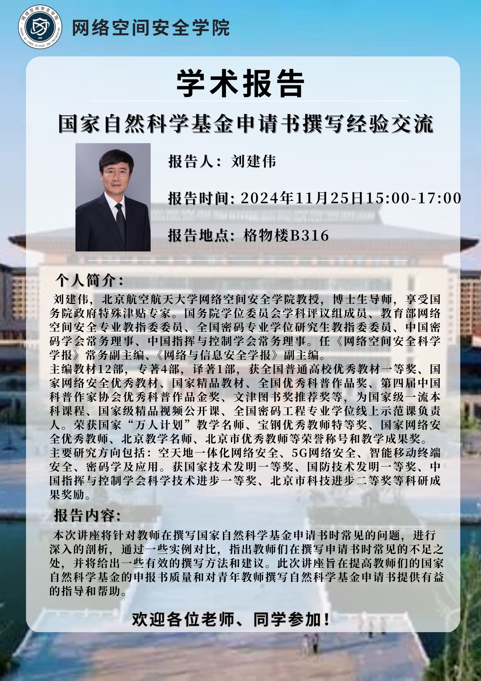 网络空间安全学院学术讲座:国家自然科学基金申请书撰写经验交流