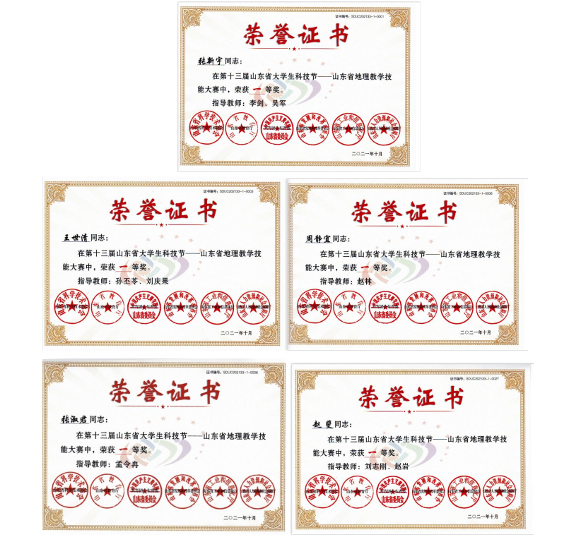 曲阜师大新闻中心讯(通讯员:吴军  李剑)  近日,第十三届山东省大学生科技节——山东省大学生地理教学技能大赛落下帷幕。曲阜师大地理与旅游学院共选派13名选手参加比赛,5名同学获得一等奖,8名同学获得二等奖,其中,张新宇、王世清同学分获第一名和第三名,再次展示了学校地理科学(师范)专业的优秀育人成绩。