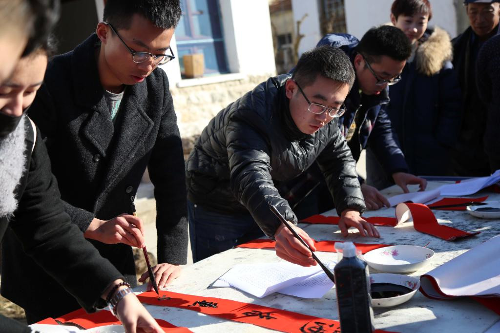 宋庄写生基地是我校优秀校友张涛的自主创业单位,书法学院积极响应校团委号召,与校团委共同组织建立实践基地,旨在深入了解社会、服务地方、体验社情民意和就业见习。鼓励大学生以校友自主创业为榜样,把自己的学习所得与实际社会需求相结合,不断服务群众,在实践中经风雨、做贡献、长才干。随后书法学院学生发挥专业特长,根据村民的需要现场书写春联,气氛热烈,暖意浓浓。