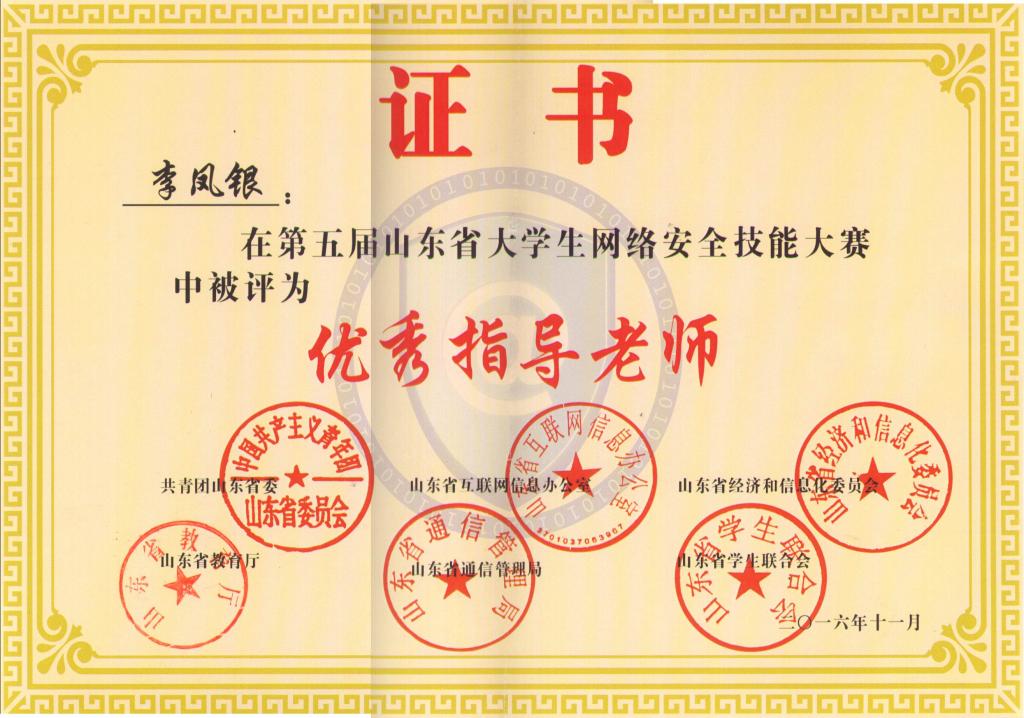 近日, 在第五届山东省大学生网络安全技能大赛中,我校信息科学与工程学院学生获得团体三等奖,指导教师李凤银被评为优秀指导教师。