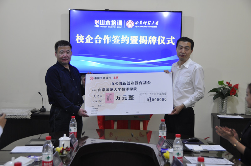 杨永明和王总共同为我校教育实习基地(NO 1042)揭牌,翻译学院党总支书记李金雷和山木培训集团人才部总监黄金惠美签署了合作协议,并代表翻译学院接受山木培训集团设立的“山木创新创业教育基金”两万元。信息科学与工程学院与山木培训集团达成初步合作意向。