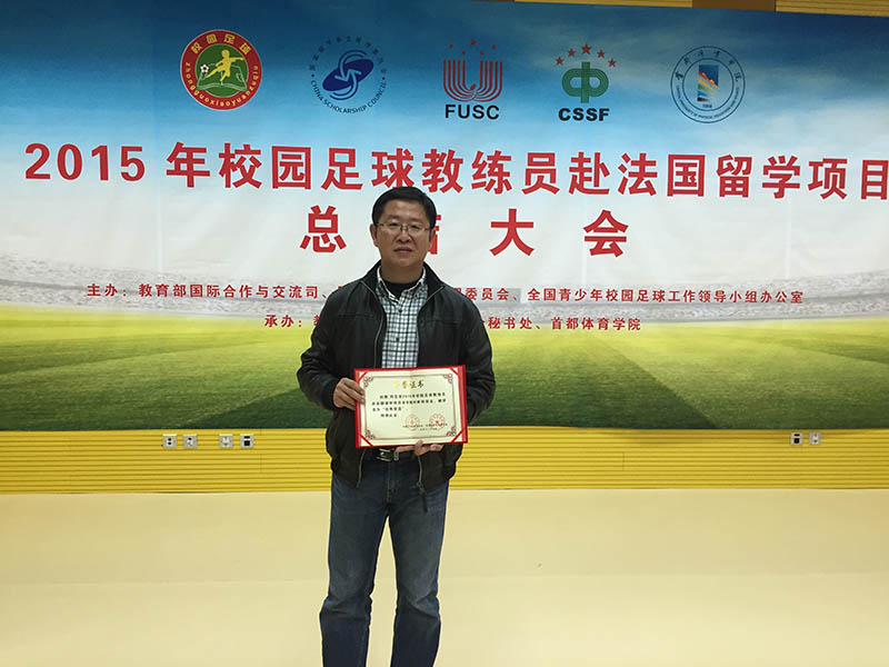 作为中法高级别人文交流机制的重要成果之一,中国校园足球教练员由全国青少年校园足球工作领导小组办公室、教育部、国家留学基金委、中国大学生体育协会等联合选派,自2015年起在全国范围内选派校园足球教练员赴法国留学,留学时间为2015年9月6日至12月12日。我校体育教学部教师刘刚经过选拔和推荐,被教育部确定为2015赴法国留学项目人选,通过3个月的学习,于2015年12月11日学成归来。