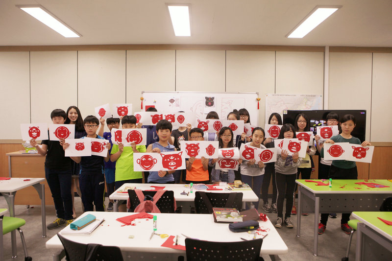 与此同时,在孔子学院的教室里,剪纸和彩绘京剧脸谱活动也吸引了众多的学员前来体验,他们在孔院教师们的指导下,剪出了各种动物的图案以及各种“喜”字和“福”字,彩绘出了京剧中的不同脸谱,每做成功一件,学员们都欢呼雀跃,教室里时不时地充满了欢声笑语。易东书院的文化体验活动结束后,尤其吸引韩国学生和民众的包饺子活动在孔子学院教室内举行,孔院的汉语教师们和韩国学生们一起充满热情地和面、拌馅儿、擀皮儿、下水饺,各有分工,秩序井然。