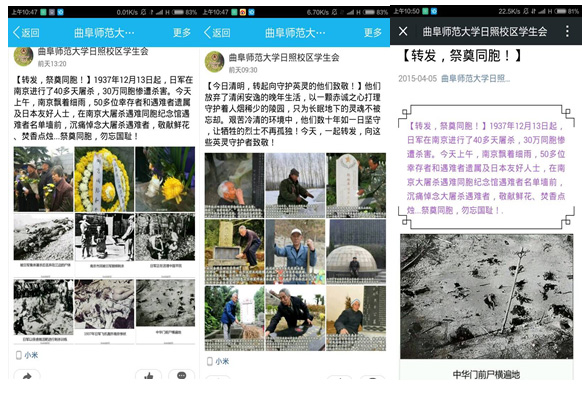 为弘扬传统文化,对学生进行爱国主义教育。近日,日照校区在清明假期期间,利用qq空间、微信新媒体开展网上祭奠同胞线上活动,各平台参与人数累计达2151人,此次活动是进一步加强网络宣传,创新开展学生活动的新尝试。