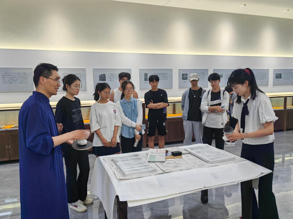 在拓片体验环节中,邀请了孔子博物馆纸质文物修复师谭淡,通过拓片制作体验,同学们真切体会古籍拓片制作过程,实操体验古籍保护,体会古籍的魅力。不仅提高了同学们的动手能力和技巧,近距离接触和了解古籍,增强了古籍保护意识。