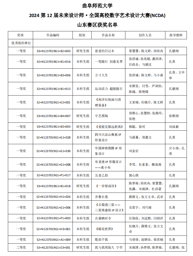 曲阜师大传媒学院讯  近日,第12届未来设计师·全国高校数字艺术设计大赛全国总评审结果和山东赛区评审结果揭晓。传媒学子在比赛中获全国奖项14件,其中一等奖3件,二等奖4件,三等奖6件,人气奖1件;在本届山东赛区中,获一等奖17件,二等奖13件,三等奖24件。