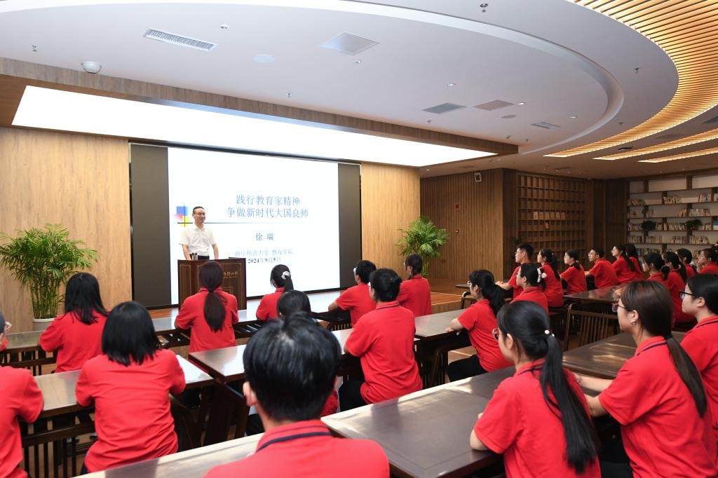 “牢记为党育人、为国育才的初心使命,树立‘躬耕教坛、强国有我’的志向和抱负”,这是习近平总书记赋予新时代人民教师的崇高使命。教育学院将以即将到来的第四十个教师节为契机,教育引导全院师生深入学习贯彻习近平总书记关于教育的重要论述和党的二十届三中全会精神,牢记为党育人、为国育才的初心使命,勇作大力弘扬、研究阐释和自觉践行教育家精神的排头兵,为强国建设、民族复兴伟业积极贡献力量。