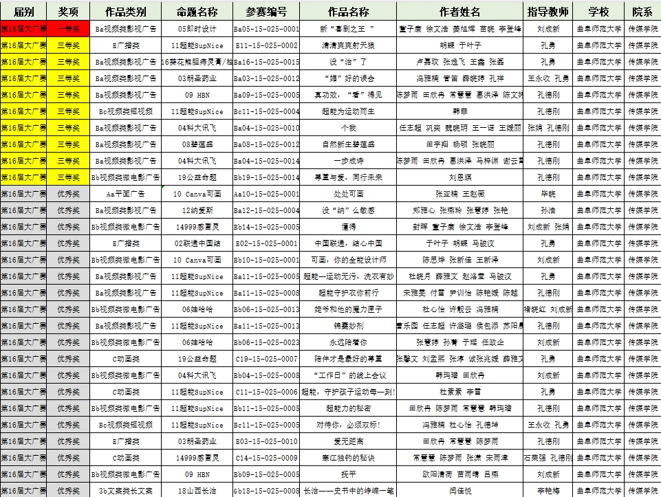 传媒学院讯 近日,第16届全国大学生广告艺术大赛全国总决赛喜报频传,我校传媒学子在大赛中表现亮眼,获全国奖项29项,其中一等奖1项,三等奖9项,优秀奖19项;在山东赛区的评审中,获一等奖4项,二等奖14项,三等奖25项,优秀奖94项。