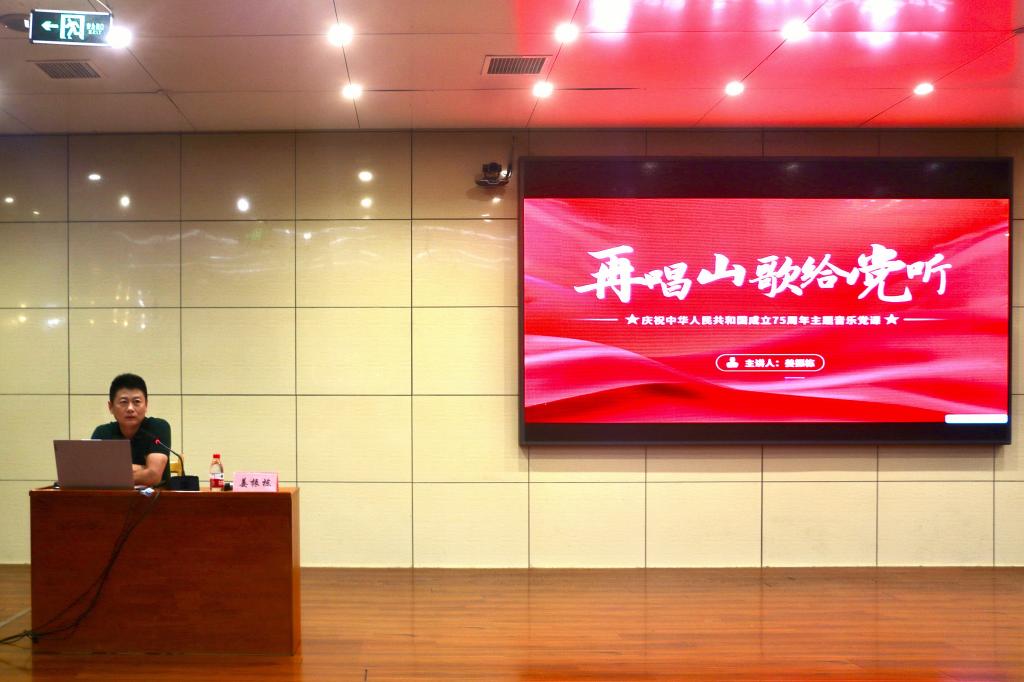 马克思主义学院讯 9月27日,为庆祝中华人民共和国成立75周年,弘扬伟大建党精神,马克思主义学院党委副书记姜振栋,为马克思主义学院、管理学院、翻译学院学生讲授了题为“再唱山歌给党听”的音乐党课,以音乐谱写初心使命,用歌声传承红色基因。