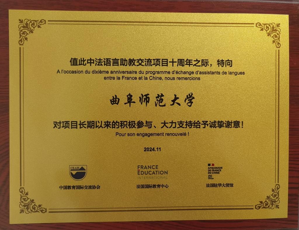 庆祝活动上,曲阜师大获颁中法语言助教交流项目十周年致谢牌,以表彰学校长期以来对项目的积极参与和大力支持。曲阜师大将以项目举办十周年为契机,再接再厉,接续做好法语助教聘用和汉语助教的选派工作,为中法教育人文交流做出更大贡献。