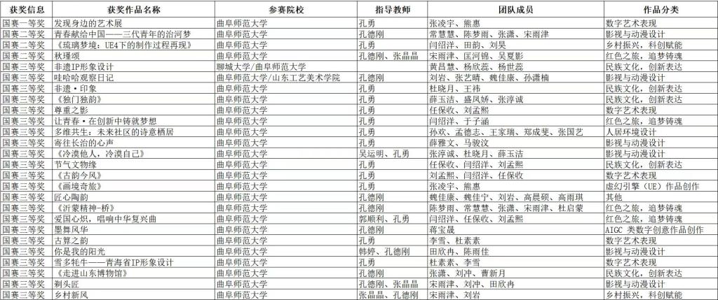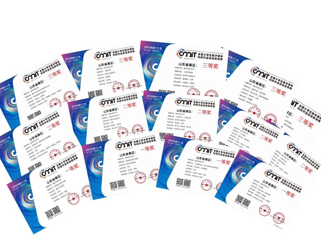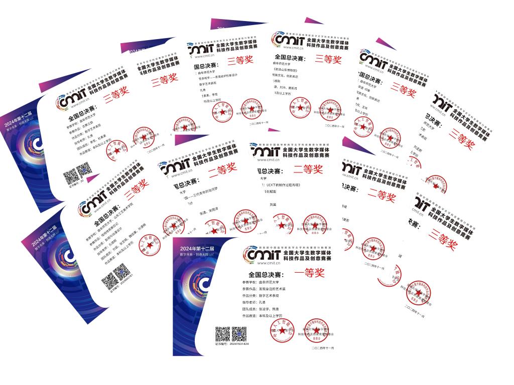 全国大学生数字媒体科技作品及创意竞赛作为教育部《全国普通高校大学生竞赛分析报告》中的重要赛事之一,由中国人工智能学会、全国大学生数字媒体科技作品及创意竞赛组委会共同主办。本届竞赛吸引了国内外40余万名师生的14万件作品参赛,参赛作品内容丰富涵盖了红色文化、乡村振兴、科技创新等多个时代主题。我校学子成绩斐然,其中,由孔勇指导,张凌宇、熊惠创作的作品《发现身边的艺术展》荣获国赛一等奖,闫绍洋、刘昊创作的作品《琉璃梦境:UE4下的制作过程再现》和宋雨津等人创作的作品《秋瑾颂》荣获国赛二等奖;由孔德刚指导,常慧慧等人创作的作品《青春献给中国——三代青年的治河梦》荣获国赛二等奖。传媒学院教师孔勇荣获全国总决赛优秀指导老师和山东赛区优秀指导老师的称号,孔德刚荣获山东赛区优秀指导老师的称号。