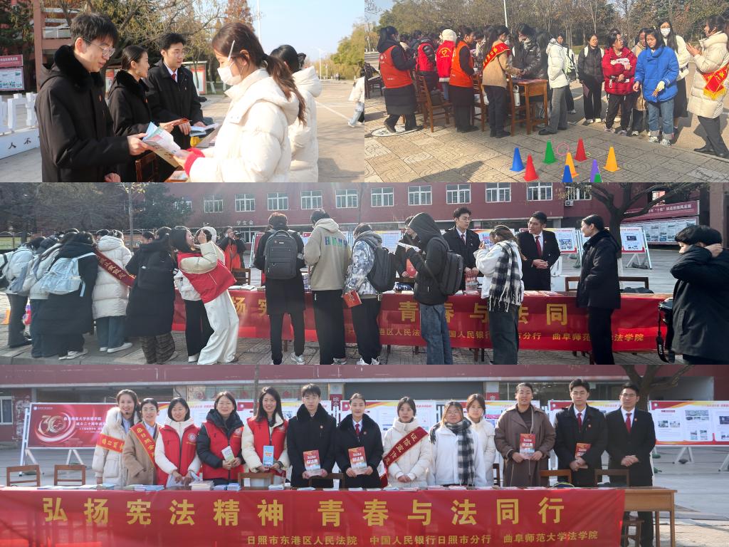 法银院齐上“宪”,共建法律安全线。为加强法治校园建设,学院携手日照市东港区人民法院、日照银行于12月3日开展以“弘扬宪法精神 青春与法同行”为主题的宪法宣传活动。在校园中,学院志愿者们与法院、银行工作人员一同支起“法治小摊”,通过设立法律咨询台、发放法治宣传手册、开展宪法知识问答、趣味普法游戏等吸引了广大师生积极参与,进行了宪法宣传。此次三方联合举办活动,引导广大师生不断增强法治意识,凝聚宪法共识,为青春保驾护航。
