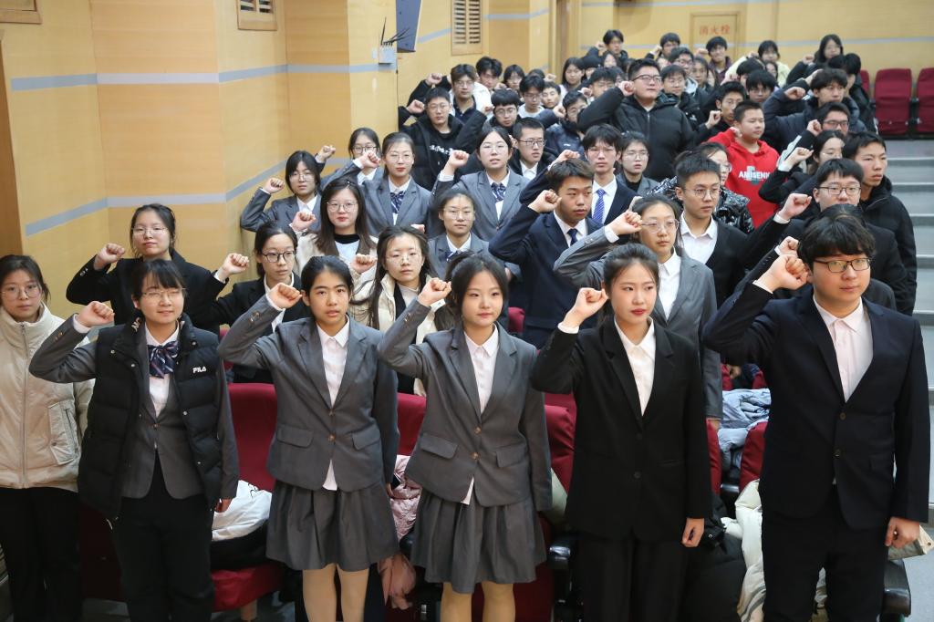 学院副院长许勇军强调了期末考试的校纪校规要求,简单介绍了2024级杏坛卓越班选拔方式。全国大学生数学建模竞赛一等奖获得者朱宇菲同学代表获奖学生发言,学生代表王淑萌宣读期末诚信考试倡议书,并带领全体同学庄严宣誓。