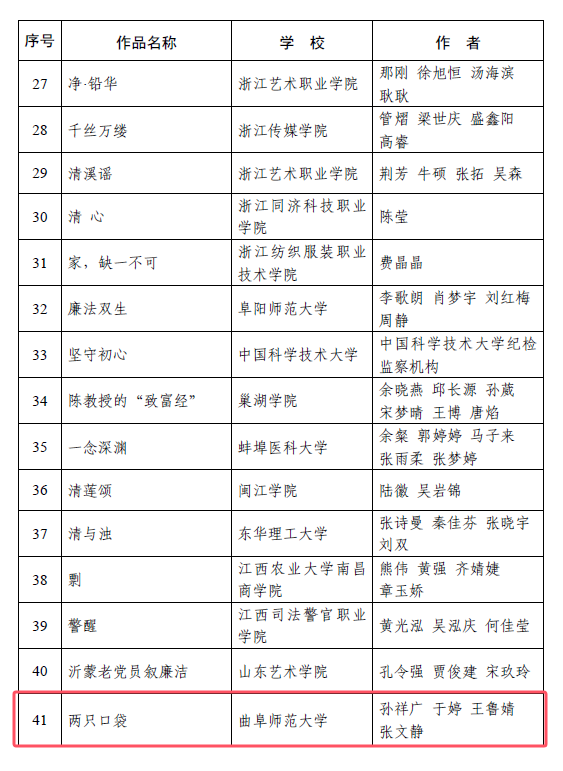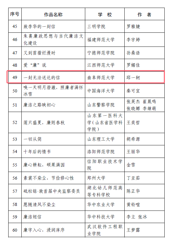曲师大纪委讯 近日,教育部公布第九届高校廉洁教育系列活动获奖结果,三亿网页版登录入口报送的两项作品获奖,《一封无法送达的信》入选“话廉润心”校园征文单元,《两只口袋》入选“视廉清心”视频征集单元。