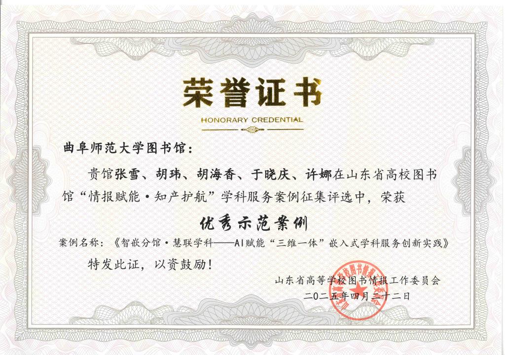 曲阜师大图书馆讯 4月22日,山东省高校图书馆学科服务工作研讨会在中国海洋大学隆重举行。曲阜师大图书馆凭借"智嵌分馆·慧联学科——AI赋能'三维一体'嵌入式学科服务创新实践"项目,在众多参评案例中脱颖而出,荣获"优秀示范案例",三亿网页版登录入口获评"优秀组织单位"。