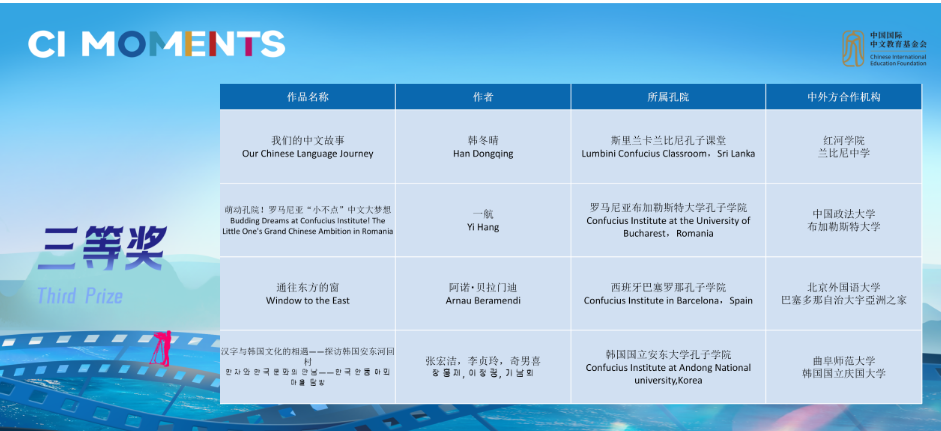 国际交流合作处讯 9月25日,第五届“最·孔院”全球短视频征集活动评选结果揭晓。曲阜师大与韩国国立庆国大学合作共建的国立庆国大学孔子学院张宏杰、李贞玲、奇男喜三位教师联合创作的作品《汉字与韩国文化的相遇—探访韩国安东河回村》荣获三等奖。本届活动共征集到来自84个国家143所孔子学院报送的616部作品。经专家评审委员会多轮精评,共评选出特等奖3部,一等奖15部,二等奖30部,三等奖100部。