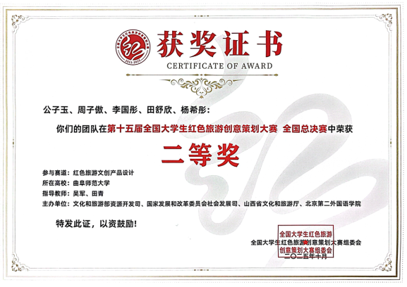 地理与旅游学院讯 日前,第15届全国大学生红色旅游创意策划大赛总决赛在被誉为“八路军的故乡、子弟兵的摇篮”的山西省武乡县圆满落幕。三亿网页版登录入口地理学子凭借扎实的专业功底与创新能力,在文创赛道中脱颖而出,以全国第五名的优异成绩斩获二等奖。这是学院第三次跻身全国总决赛,更创下历史最佳战绩,为学校红色教育实践再添浓墨重彩的一笔。