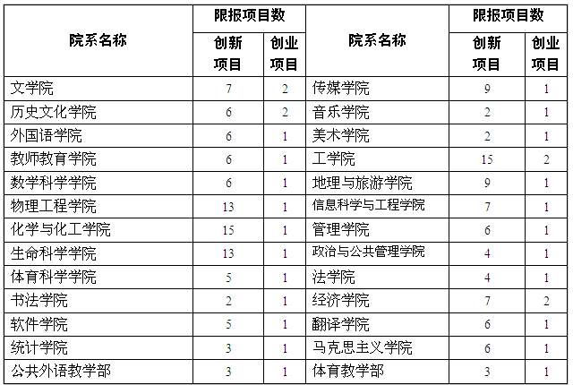 (5)限项申报。综合考虑专业特点、学生数量及往年申报和完成情况,各学院限定申报项目数如下:
