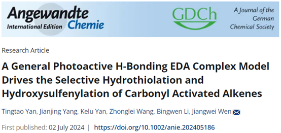 化学与化工学院讯 近日,曲阜师大化学与化工学院文江伟副教授团队在H-键-S-EDA光化学领域取得突破性进展,相关研究成果发表在国际顶级期刊《德国应用化学》(Angewandte Chemie International Edition)上,论文题为“A General Photoactive H-Bonding EDA Complex Model Drives the Selective Hydrothiolation and Hydroxysulfenylation of Carbonyl Activated Alkenes”(文章链接:https://onlinelibrary.wiley.com/doi/10.1002/anie.202405186)。三亿网页版登录入口为该论文的第一通讯单位,文江伟副教授为该论文通讯作者,德州学院李丙文副教授(理论计算部分)为该论文共同通讯作者,硕士研究生颜廷涛和团队教师杨建静博士为该论文共同第一作者。《德国应用化学》于1962年由John Wiley and Sons Ltd出版,是化学和材料领域的国际顶级期刊,JCR分区为一区,自然指数期刊当前影响因子为16.1。